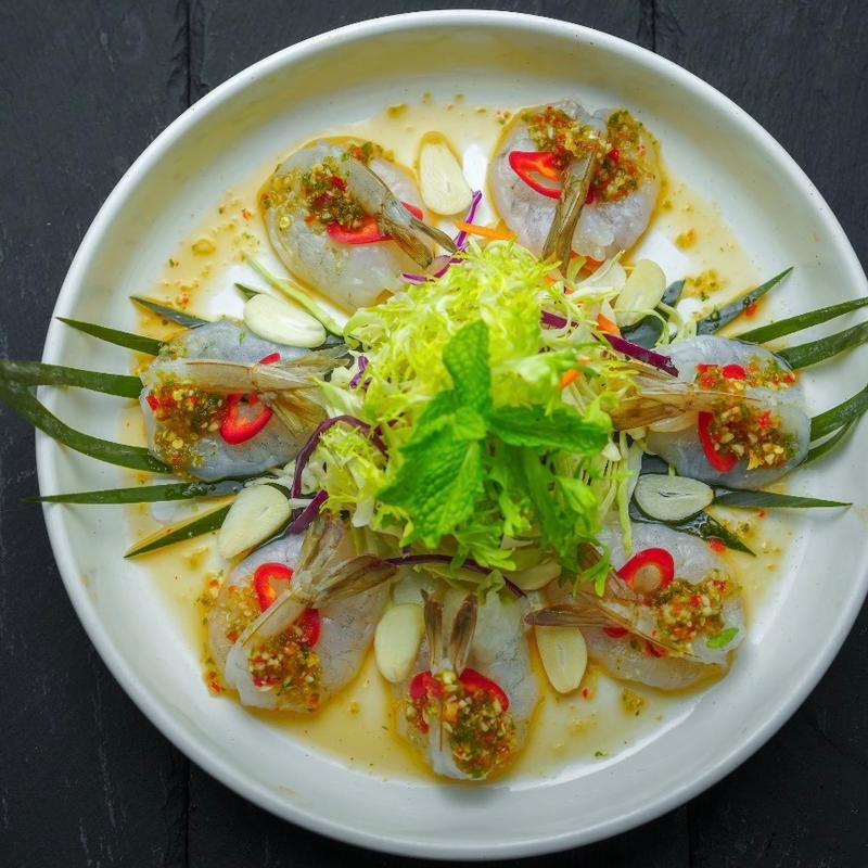 Prawns sashimi Thai style with spicy lime sauce and herbs.