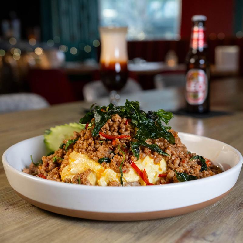 Marinated minced pork with crispy rice salad with a hint of curry paste.