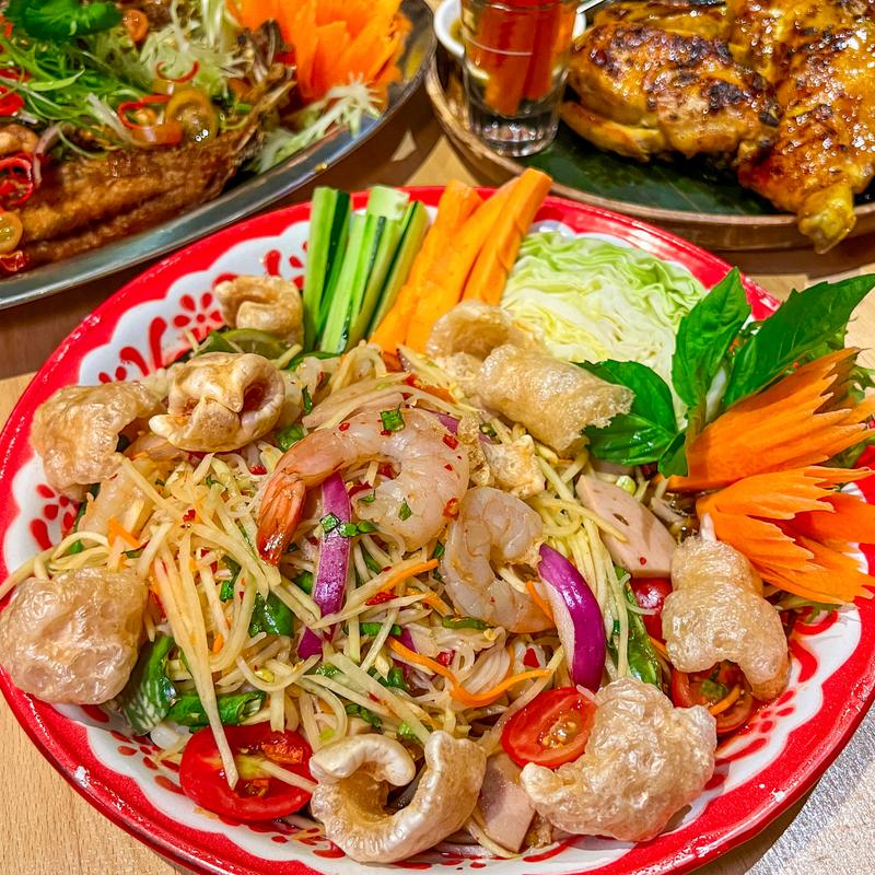 Spicy papaya salad with moo yor, crispy pork, kanom jeen, and dried shrimp with seafood.