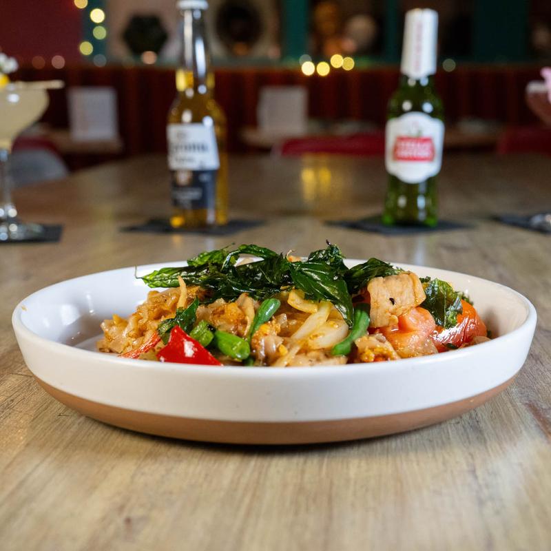 Wok-fried egg noodles with soft Thai omelet and dried chili.
