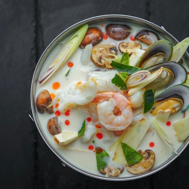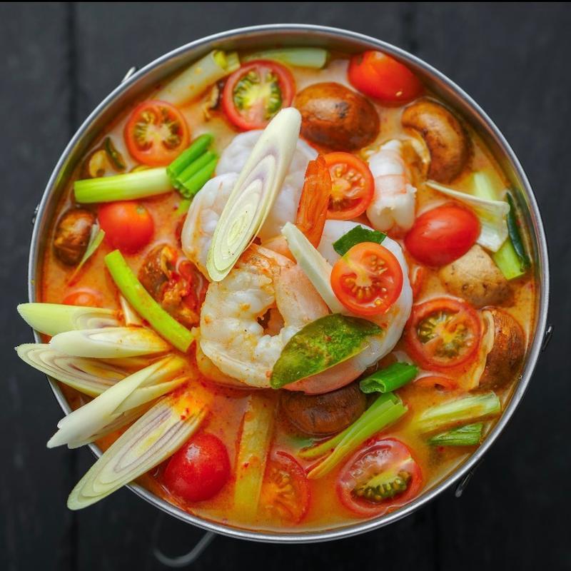 Hot and spicy soup with baby pork spare rib, chicken stock, galangal, lemongrass, lime leaves, cherry tomatoes, spring onion, and shallot.