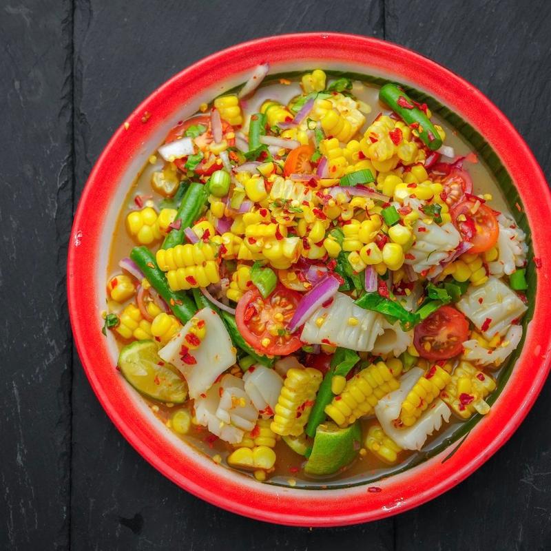 Spicy corn salad with boiled squid cherry tomato, green bean, lime juice, Thai chili, and shallot.