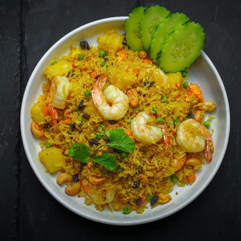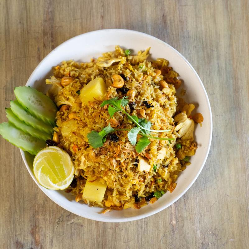 Fried rice with pineapple, egg, carrots and pea, curry powder, raisins