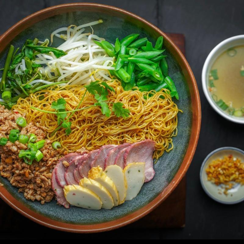 Thin Egg Noodle with BBQ Pork, Minced pork, fish cake and Crispy Wonton