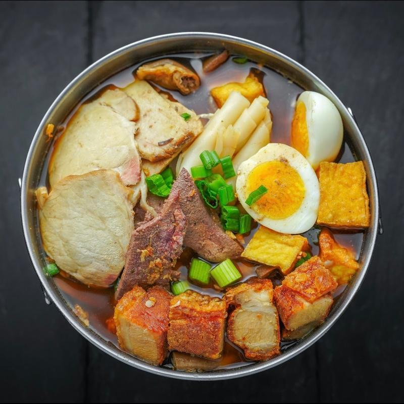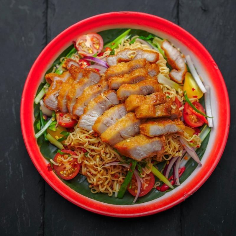 Hot & sour noodle soup with minced pork, BBQ pork, fish ball, and crispy wonton.