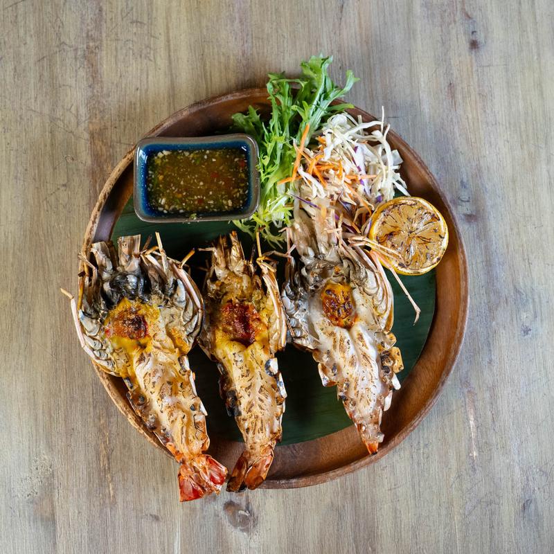 Grilled king-size river prawns with spicy hot seafood sauce 1 lb serving portion.