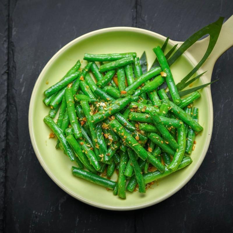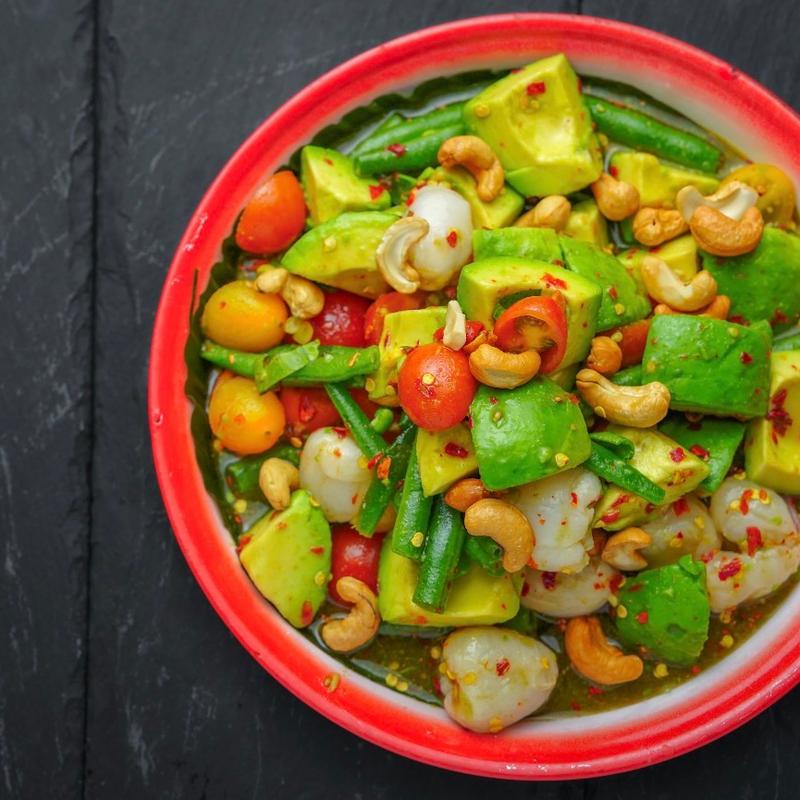 Thai spicy avocado salad with green beans, lychee, cherry tomato, and cashew nut.