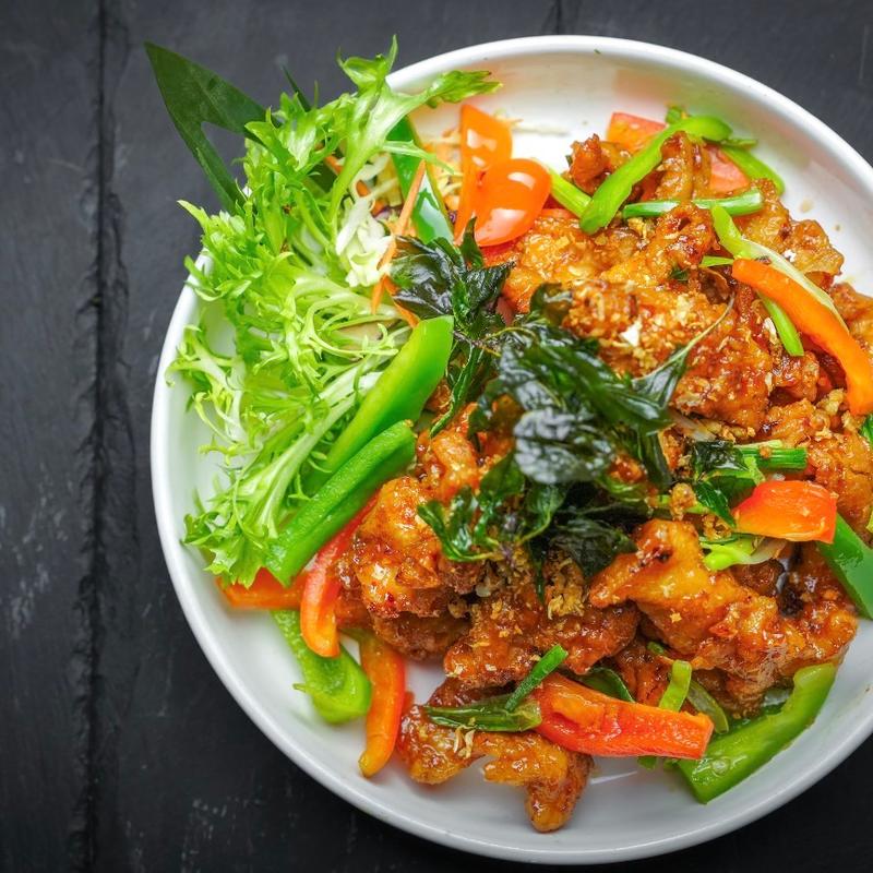 Deep-fried whole Fish topped with spicy herbs, celery, onion, roasted peanuts, and fresh mint leaves.