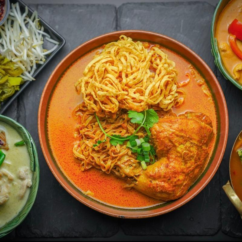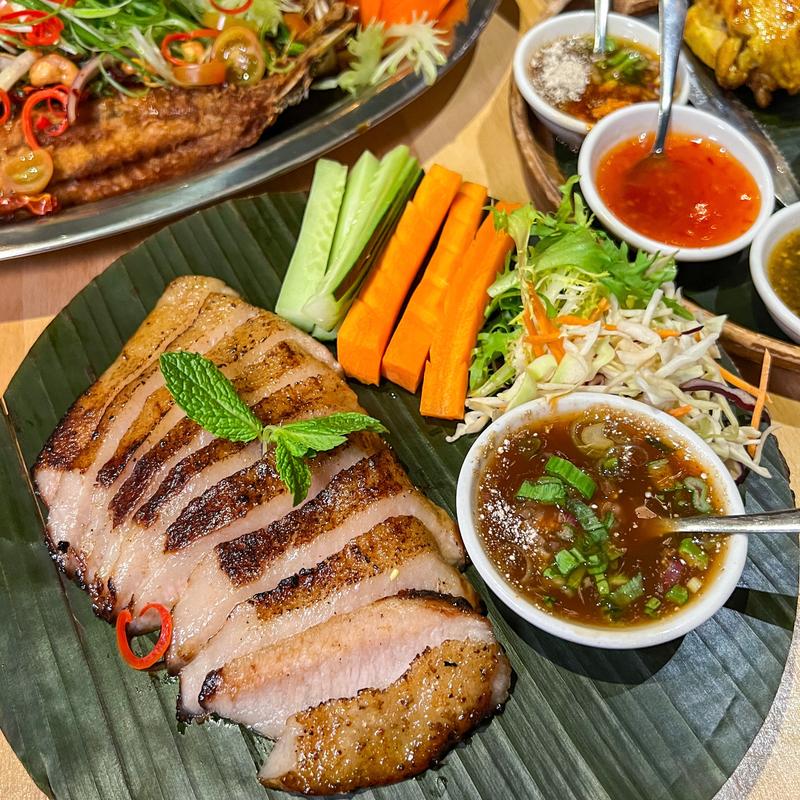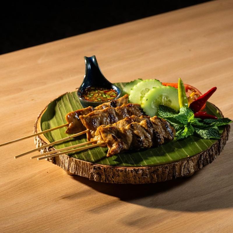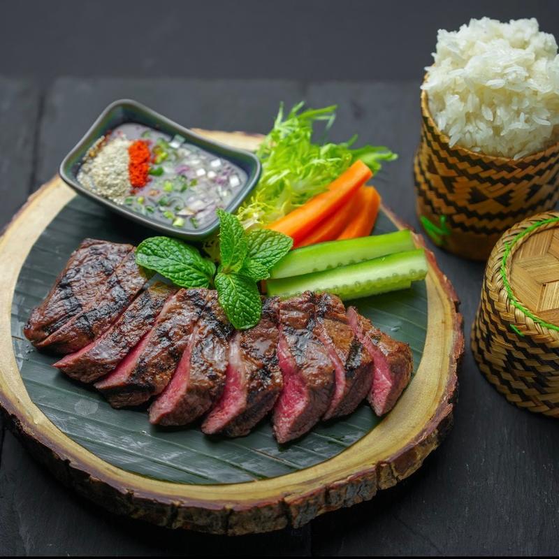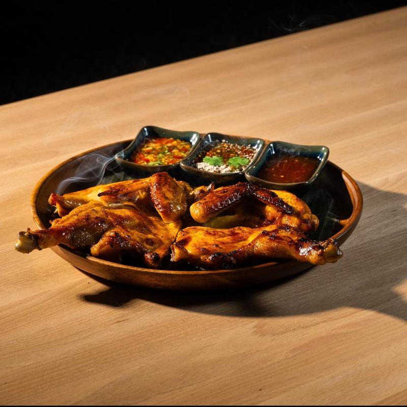 Half $15.95 | Whole $28.95 • Marinated whole chicken grilled with tamarind and fish sauce to perfection served with a duo of sweet chili sauce and traditional spicy E-sarn sauce.