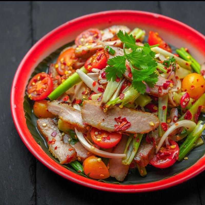 Spicy Grilled Pork jowl salad with onion, tomato, cucumber, and celery in savory Thai style dressing • Add: Glass Noodle +$3.00 | Egg Noodle +$3.00