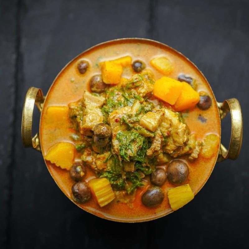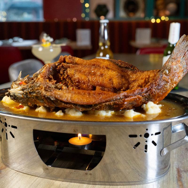 Deep-fried whole fish in sour and spicy clear curry with cabbage and cauliflower.