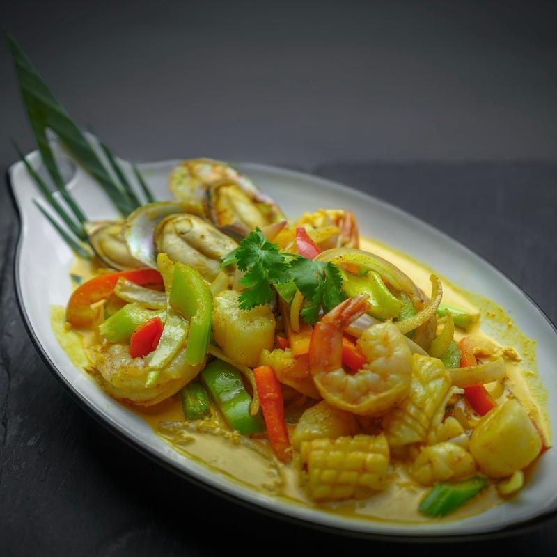Stir-fried seafood with creamy curry sauce and chili oil.