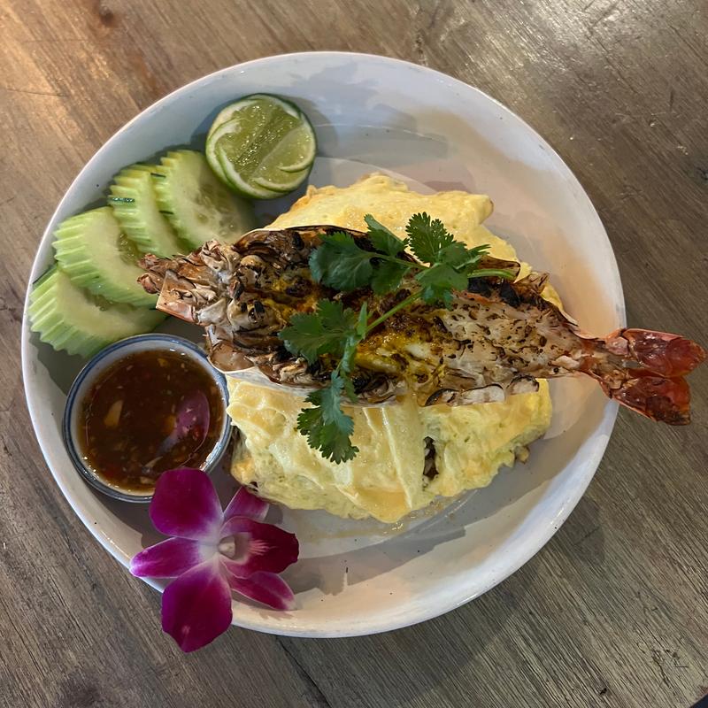 Fried rice river prawns and tiger prawns, soft omelet, and shrimp paste served with Thai spicy seafood sauce.