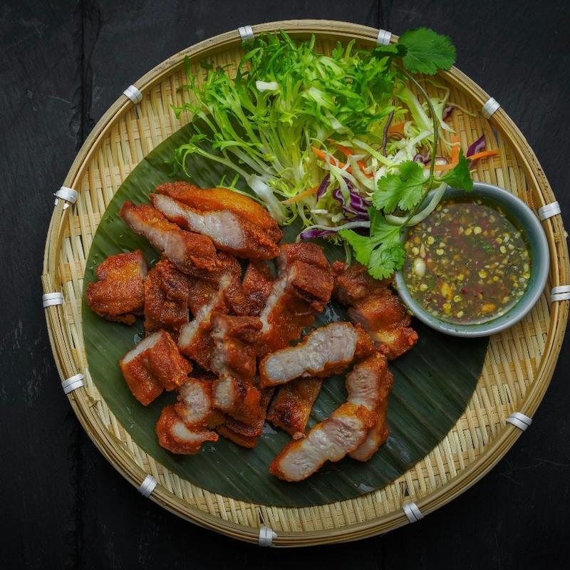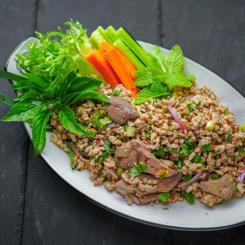 Spicy minced Pork or Chicken with pork liver and skin seasoned with herb and chili lime dressing.