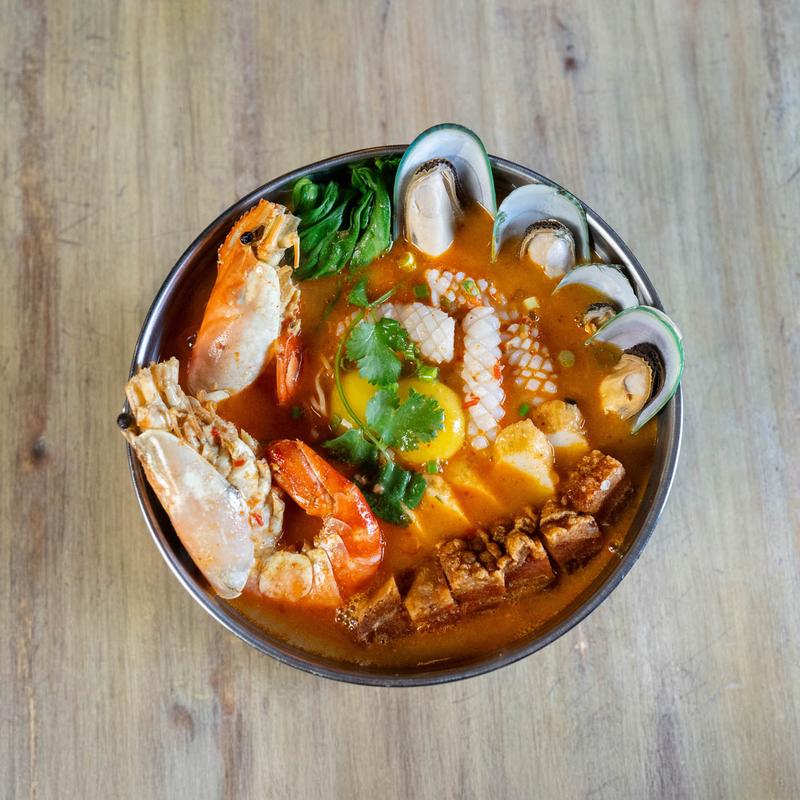 Egg noodles in tom yum soup with river prawns, seafood, mussles, crispy pork belly, fish ball, and 2 eggs serving two persons.
