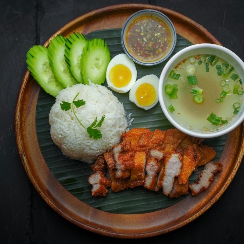 Marinated deep fry Pork over rice served with Special Dipping sauce and hard boil eggs